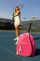 With dimensions of 19"H x 15"W x 6"D, plus a 3" deep racket sleeve, the Priscila comfortably carries two tennis rackets or four pickleball paddles—because yes, you can have it all. Inside, vibrant satin linings make it easy to spot your essentials, while a zippered front pocket, padded laptop sleeve, and four holders (for bottles, cans, or balls) keep you ready from the office to the baseline.