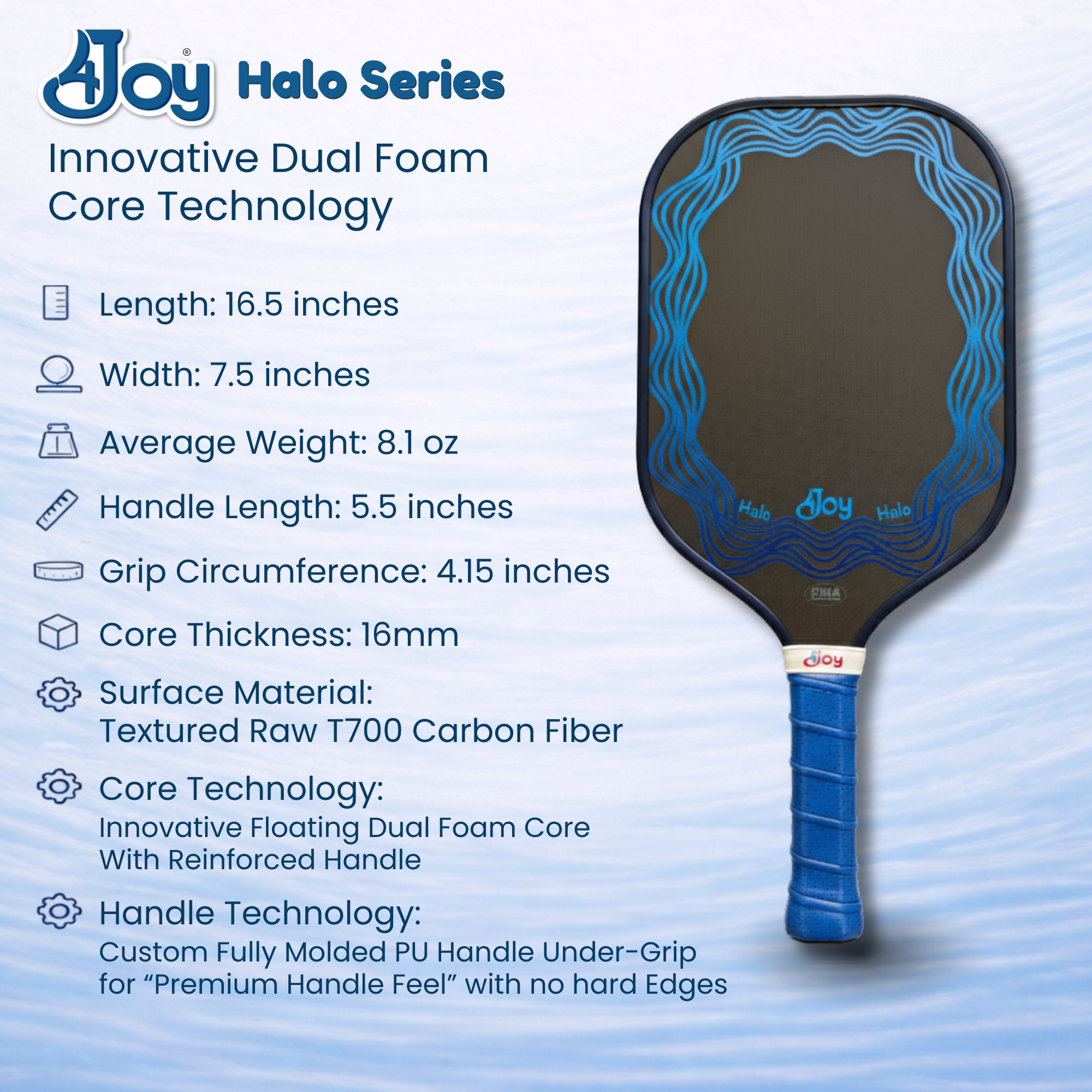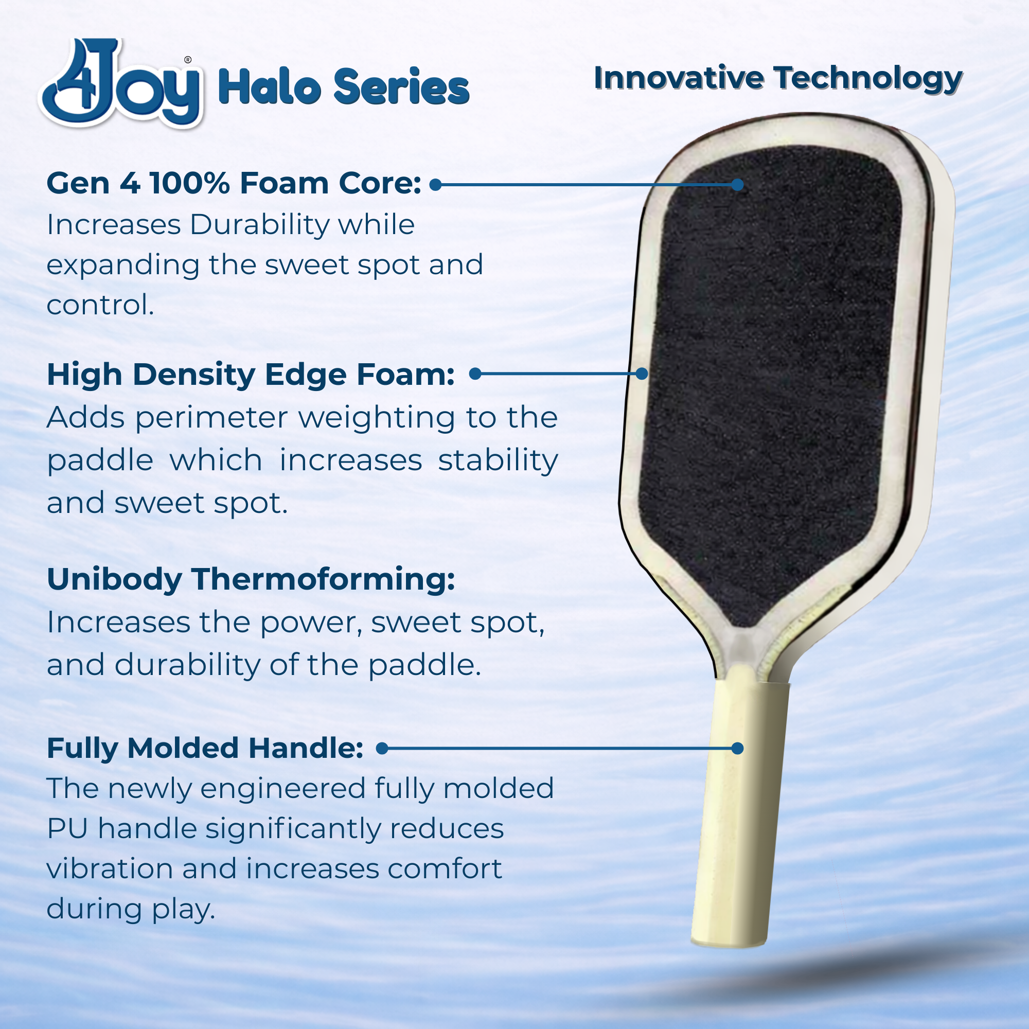 The 4Joy Halo Series is built around one breakthrough idea: next-level stability without sacrificing touch or power. At the heart of the Halo is our Innovative Floating Dual Foam Core, engineered with a higher-density foam edge and a carefully tuned combination of foam thickness and density throughout the paddle. This advanced construction expands the sweet spot, improves perimeter stability, and delivers a more consistent, forgiving response across the entire face.